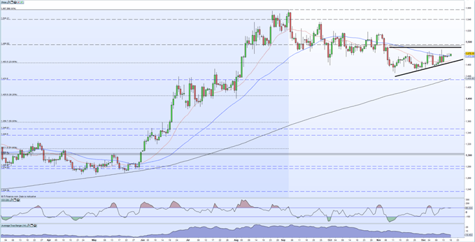 The daily gold chart shows a medium-term downtrend being counter-balanced by a short-term uptrend, with a series of lower highs from the September 4 peak being countered by a series of higher lows from November 12. This is contracting gold’s trading spread and making a pennat formation, a technical set-up that normally precedes a sharp breakout. Current trading conditions are quiet ahead of the year-end, adding to the possibility of a sharp move.